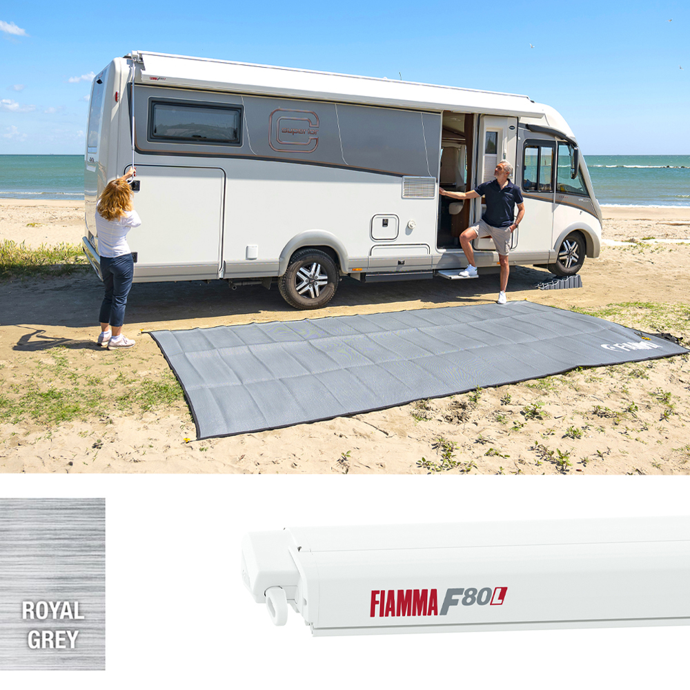 The Fiamma F80L winch operated awning is suitable for roof installation on large motorhomes and caravans. This model is made up of a Polar White aluminium casing, housing a Royal Blue awning fabric.